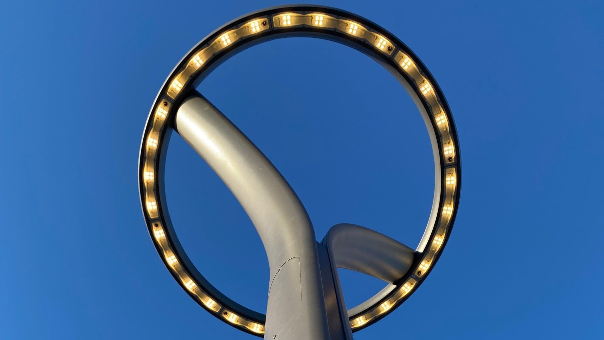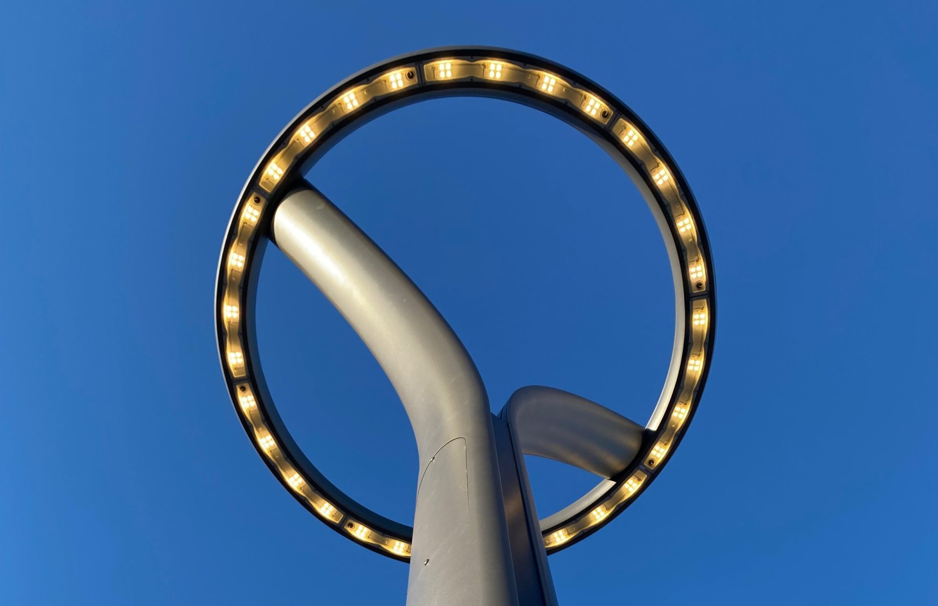 Dominant à 6 mètres de hauteur, avec une circonférence de l’anneau à 2.3 mètres et pesant 400kg, le luminaire Archy a été placé au centre d’un rond-point en Auvergne-Rhône-Alpes.