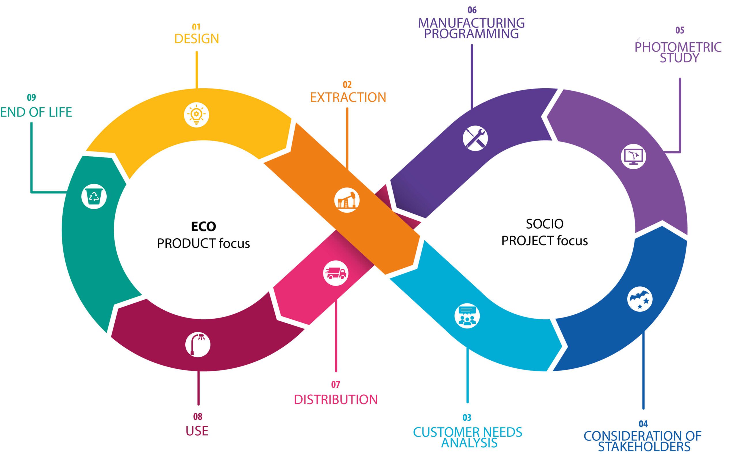 Our design teams are trained in the life-cycle analysis of our luminaires, which we carry out in compliance with the international PEP Ecopassport® standard. The PEP (Product Environmental Profile) is an environmental declaration compliant with ISO 14025, which enables the various environmental impacts resulting from an LCA (Life-Cycle Analysis) to be communicated in compliance with ISO 14040 and ISO 14044. The LCA is an essential tool to help our customers choose the lowest-impact offers.
