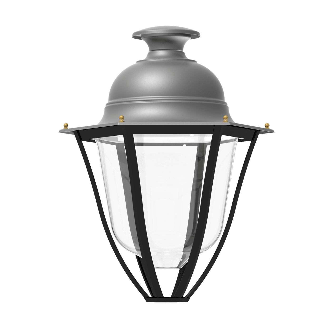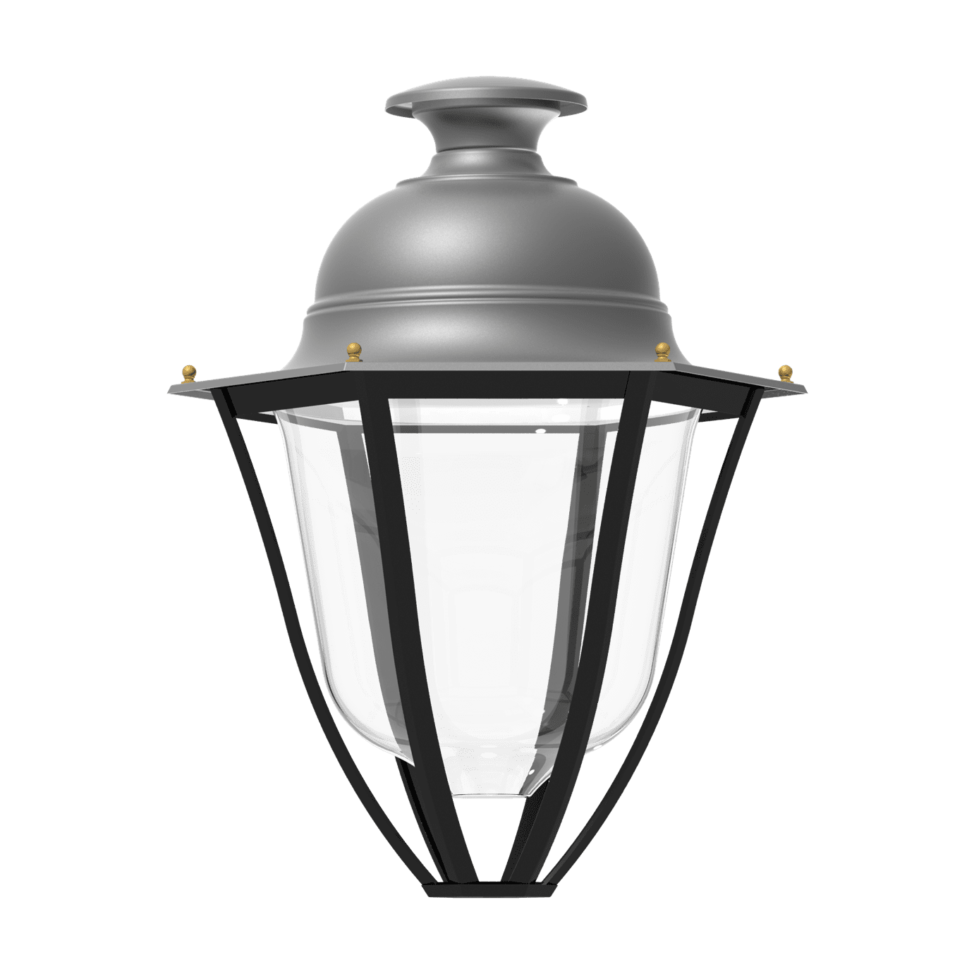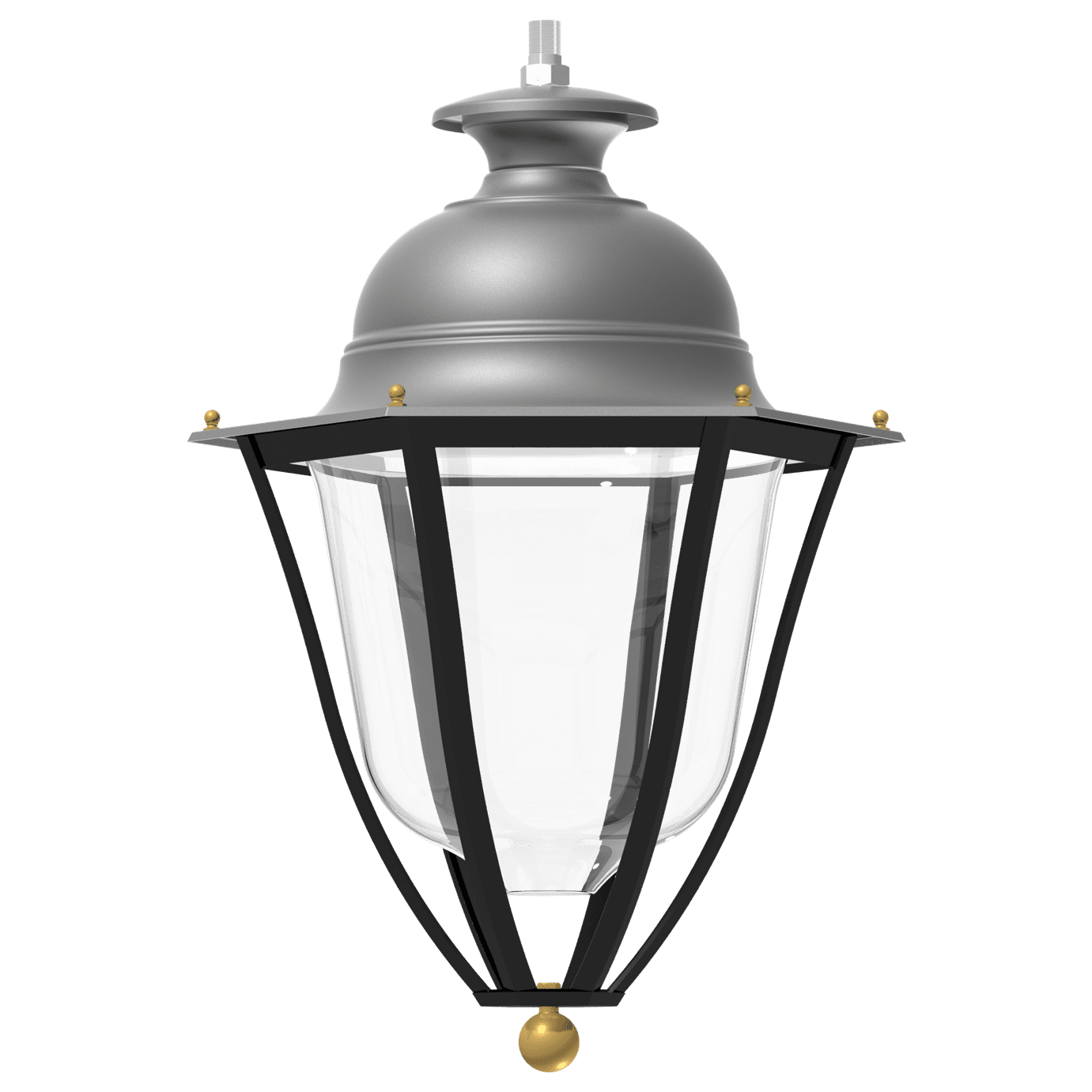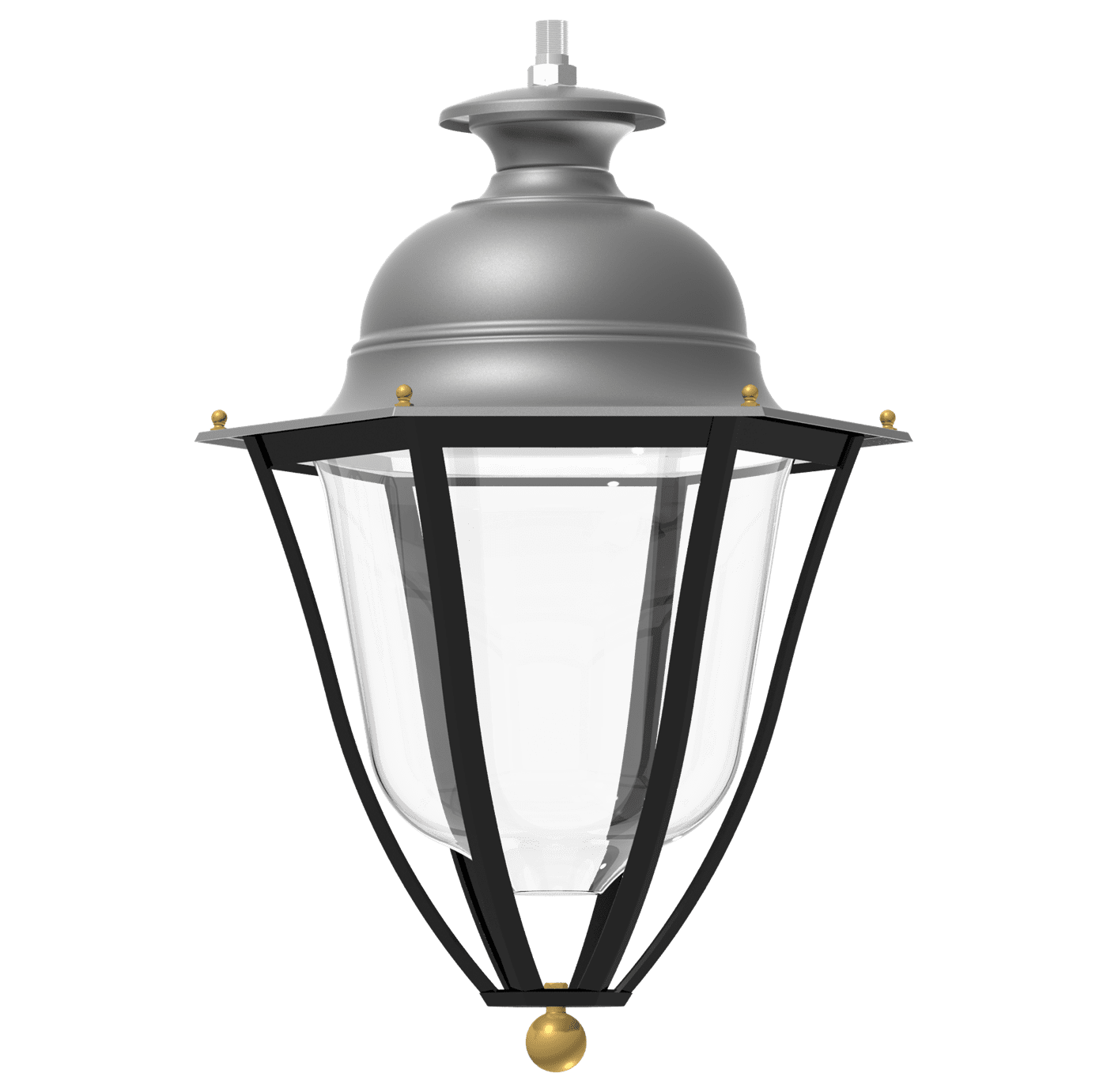 Valbonne is a traditional luminaire dedicated to ambient lighting. Its elongated pyramidal cage with slightly curved lines consists of a hexagonal base made of aluminum, copper or embossed brass, each top of which is decorated with a small brass ball on top. It is topped by a bell-shaped dome. Underneath, a larger brass ball has been added to the base of the luminaire to complete its aesthetic in a suspended version. The Valbonne lantern receives from 8 to 64 LEDs and allows, via the color temperatures of 3000 K or 4000 K, to provide a lighting respectful of the regulation against light nuisance. It can be equipped with intelligent devices thanks to the integration of Zhaga or NEMA standard sockets and its Zhaga D4i (Book 18) certification. It is equipped with an EVO2 LED module and its optical compartment is IP66 and IK08 (IK10 on request).