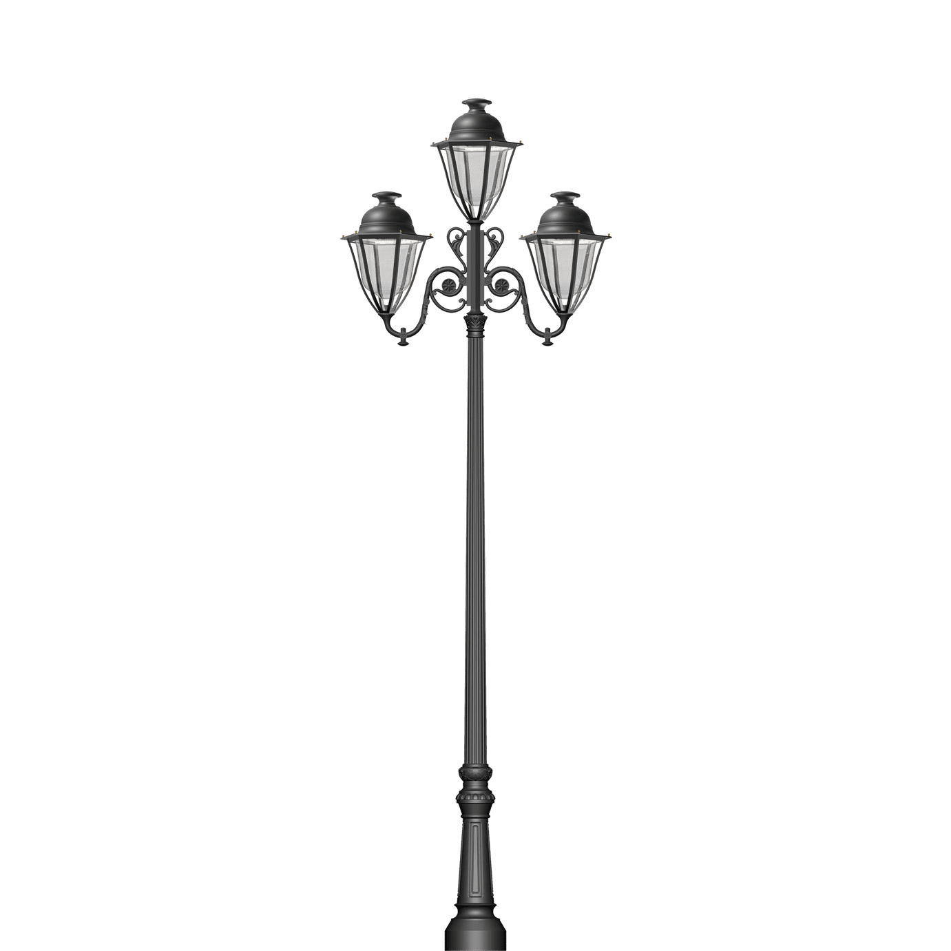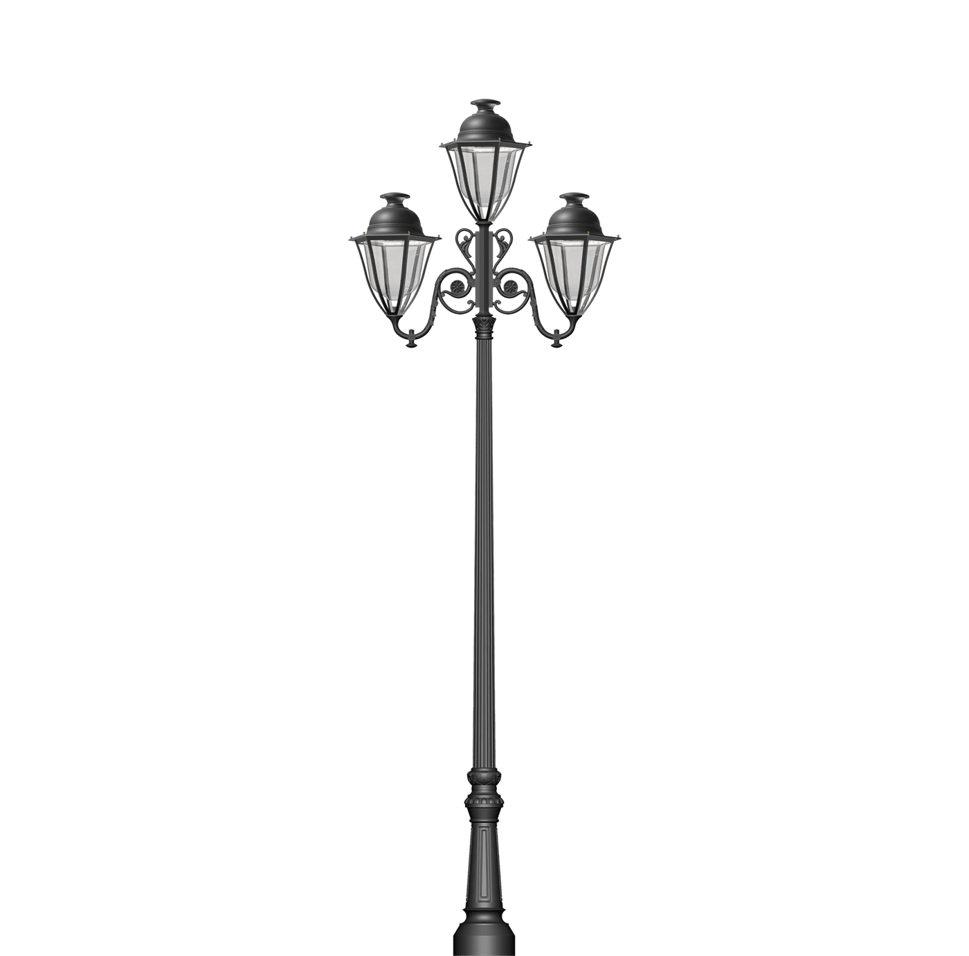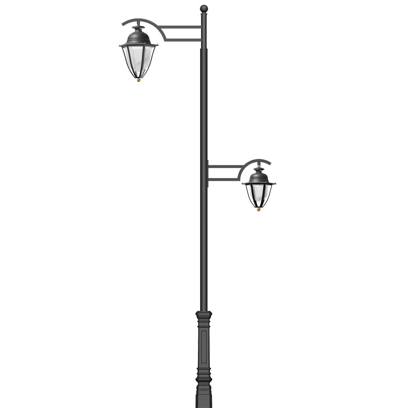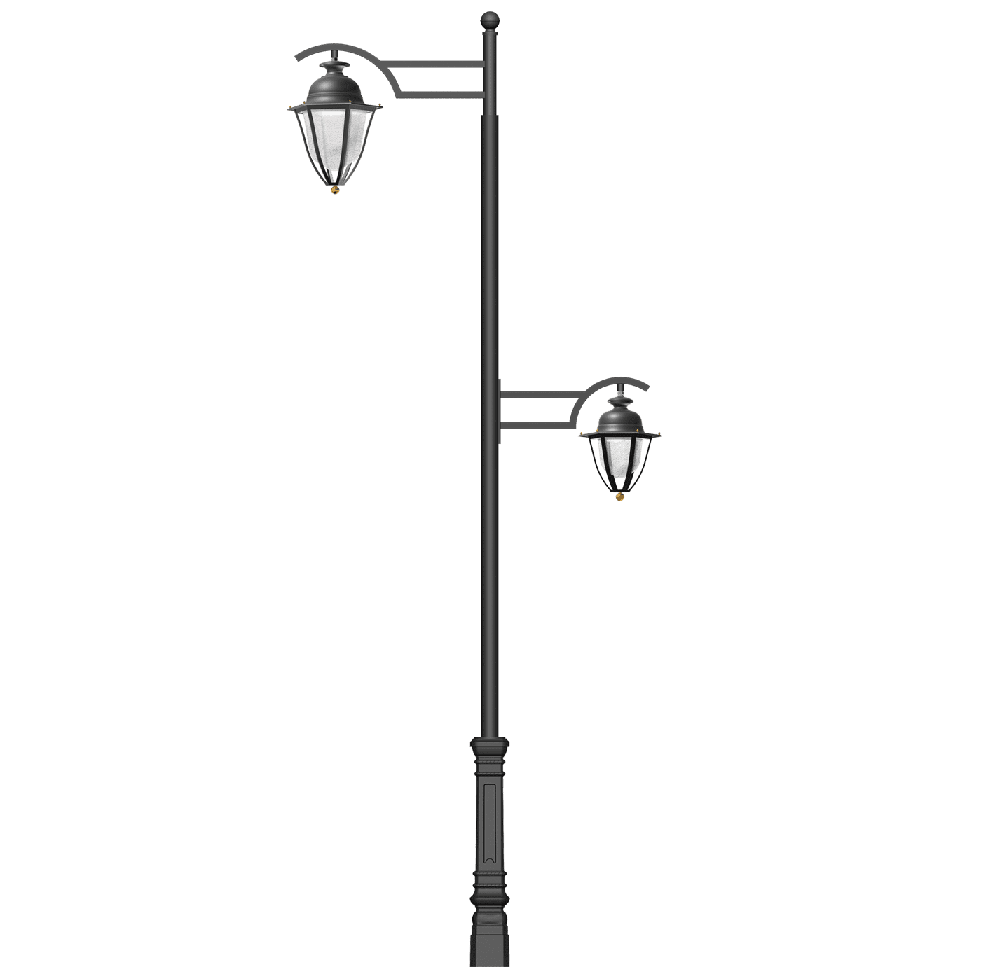 Valbonne is a traditional luminaire dedicated to ambient lighting. Its elongated pyramidal cage with slightly curved lines consists of a hexagonal base made of aluminum, copper or embossed brass, each top of which is decorated with a small brass ball on top. It is topped by a bell-shaped dome. Underneath, a larger brass ball has been added to the base of the luminaire to complete its aesthetic in a suspended version. The Valbonne lantern receives from 8 to 64 LEDs and allows, via the color temperatures of 3000 K or 4000 K, to provide a lighting respectful of the regulation against light nuisance. It can be equipped with intelligent devices thanks to the integration of Zhaga or NEMA standard sockets and its Zhaga D4i (Book 18) certification. It is equipped with an EVO2 LED module and its optical compartment is IP66 and IK08 (IK10 on request).