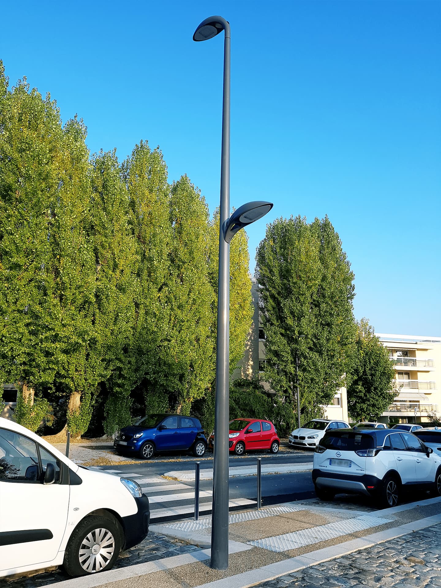 L’ensemble Nations est composé d’un mât en acier galvanisé et d’un luminaire en aluminium. Sa silhouette élancée présente une tête de mât ajourée au bout de laquelle se trouve la partie optique de forme demi-ovale & légèrement pointue protégée par un verre trempé IK08 et étanche IP66. Avec sa ligne continue, il affiche une allure d’inspiration végétale. Pouvant être installé contre un poteau ou un mur, Nations est prévu pour des hauteurs allant de 5 à 9 mètres et pouvant accueillir un ou deux feux, Le module qu’il abrite peut accueillir de 8 à 48 LED.