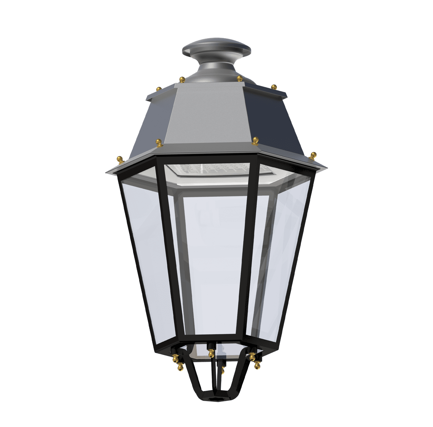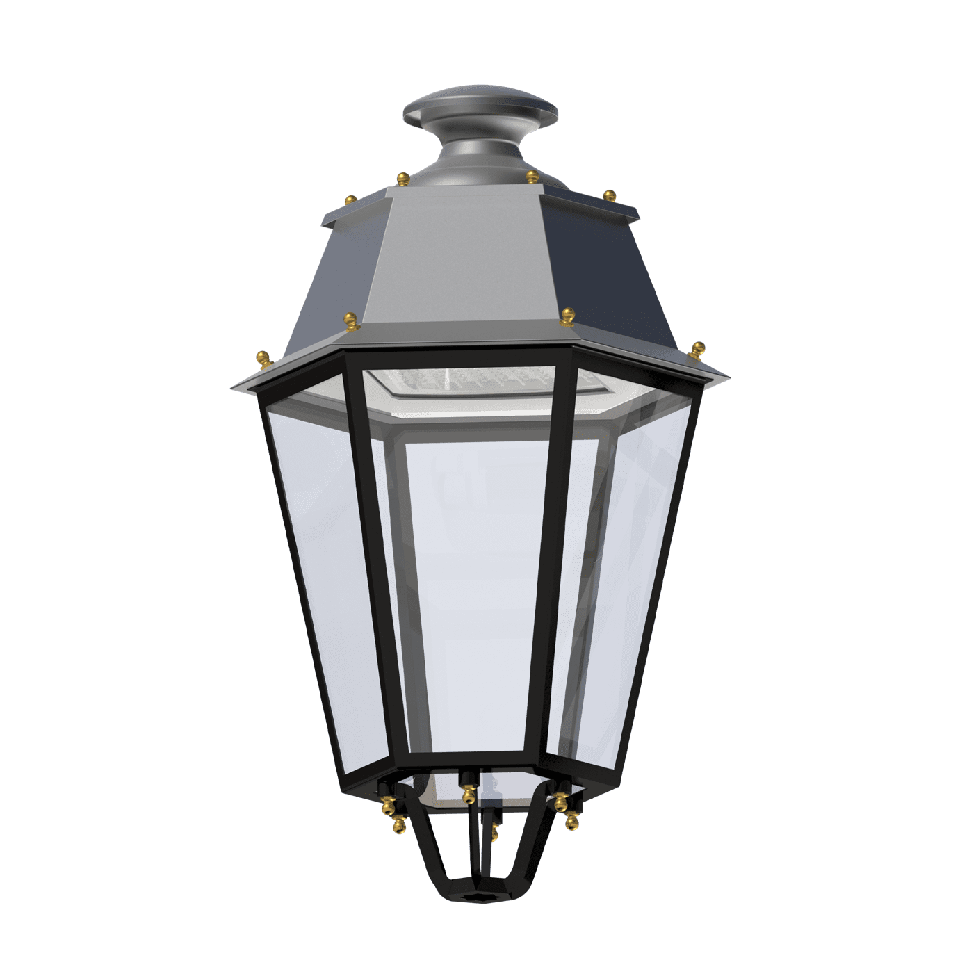 Saint-Paul est un luminaire traditionnel à six faces dédié à l’éclairage d’ambiance. Sa cage allongée de forme pyramidale inversée est tronquée et est constituée d’une base hexagonale réalisée en acier inoxydable, cuivre ou laiton. Elle est surmontée d’un chapeau également de forme hexagonale dont chaque sommet est orné d’une bille en laiton, sur le dessus et à la base. En dessous, un étirer à six bras décorés de petites billes en laiton à chacune de leur extrémité vient soutenir l’ensemble. Une bille en laiton plus volumineuse a été ajoutée à la base de l’étrier pour parfaire l’esthétique du luminaire en version suspendue. La lanterne Saint-Paul reçoit de 8 à 64 LED et permet, via les températures de couleur de 3000 K ou 4000 K, de fournir un éclairage respectueux de la réglementation contre les nuisances lumineuses. Il peut être équipé de dispositifs intelligents grâce à l’intégration de socket aux standard Zhaga ou NEMA et sa certification Zhaga D4i (Book 18). Il est équipé d’un module LED EVO2 et son bloc optique est IP66 et IK08 (IK10 sur demande).